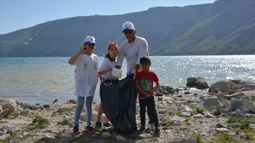 Bitlis’in Tatvan ilçesinde doğaseverler Nemrut Krater Gölü’nde çevre temizliği yaptı.