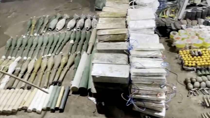 “1 doçka uçaksavar silahı, 40 tuzaklanmış el bombası, 11 taarruz el bombası, 28 el yapımı patlayıcı (EYP), 11 AK-47 piyade tüfeği, 7,62 milimetre PKMS 5 makinalı tüfek, 1 Dragunov keskin nişancı tüfeği, 5 kilogram plastik patlayıcı, 36 RPG-7 roketatar antitank mühimmatı, 5 RPG-7 roketatar antipersonel mühimmatı, 1 RPG-7 roketatar termobarik mühimmatı, 178 EYP basma düzeneği, 120 milimetre 6 havan mühimmatı, 17 bin 625 adet 12,7 milimetre mühimmat, 14 bin 400 adet 7,62 milimetre PKMS makineli tüfek mühimmatı, 135 adet 14,5 milimetre doçka uçaksavar mühimmatı, 66 adet 40 milimetre bomba atar tahrip mühimmatı, 6 adet 40 milimetre bomba atar sis mühimmatı, 5 adet 7,62 milimetre PKMS makineli tüfek yedek namlusu, 10 Dragunov keskin nişancı tüfeği şarjörü, 50 AK-47 piyade tüfeği şarjörü, 10 taarruz el bombası fünyesi, 28 adet RPG-7 roketatar sevk fişeği, bir motorlu doçka uçaksavar sehpası, 100 metre saniyeli fitil, 200 metre infilaklı fitil, çeşitli renklerde 27 sis, 2 bin 350 metre elektrik kablosu, 300 metre uydu kablosu, 4 el testeresi, 2 elektrikli ve 2 benzinli hilti, 70 hilti ucu, 3 benzinli hızar, 5 analog telefon, örgütsel doküman, 3 gaz maskesi ve filtresi, 8 akü, 5 jeneratör, 20 oksijen tüpü, 15 kutu havai fişek, bir televizyon ve çanak anten, bir adet 5 ton kapasiteli su tankı ve çok sayıda muhtelif yaşam malzemesi.”